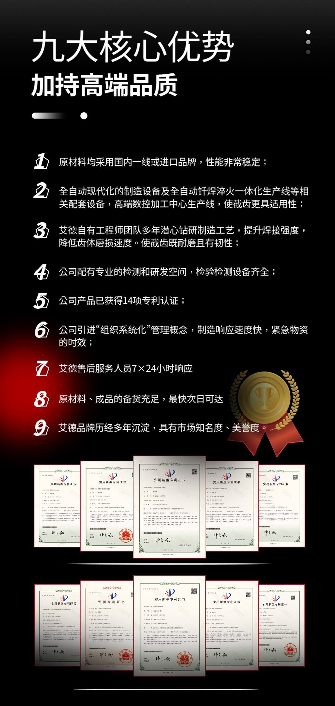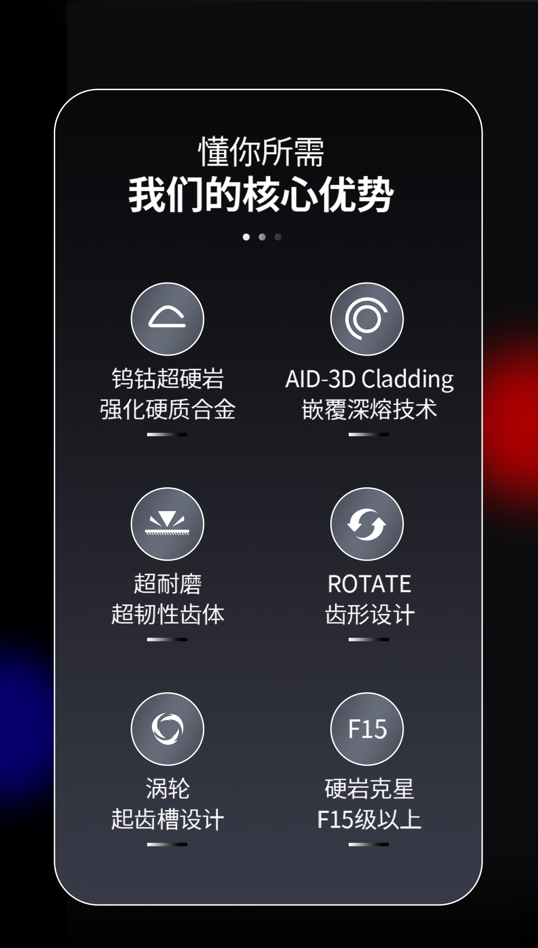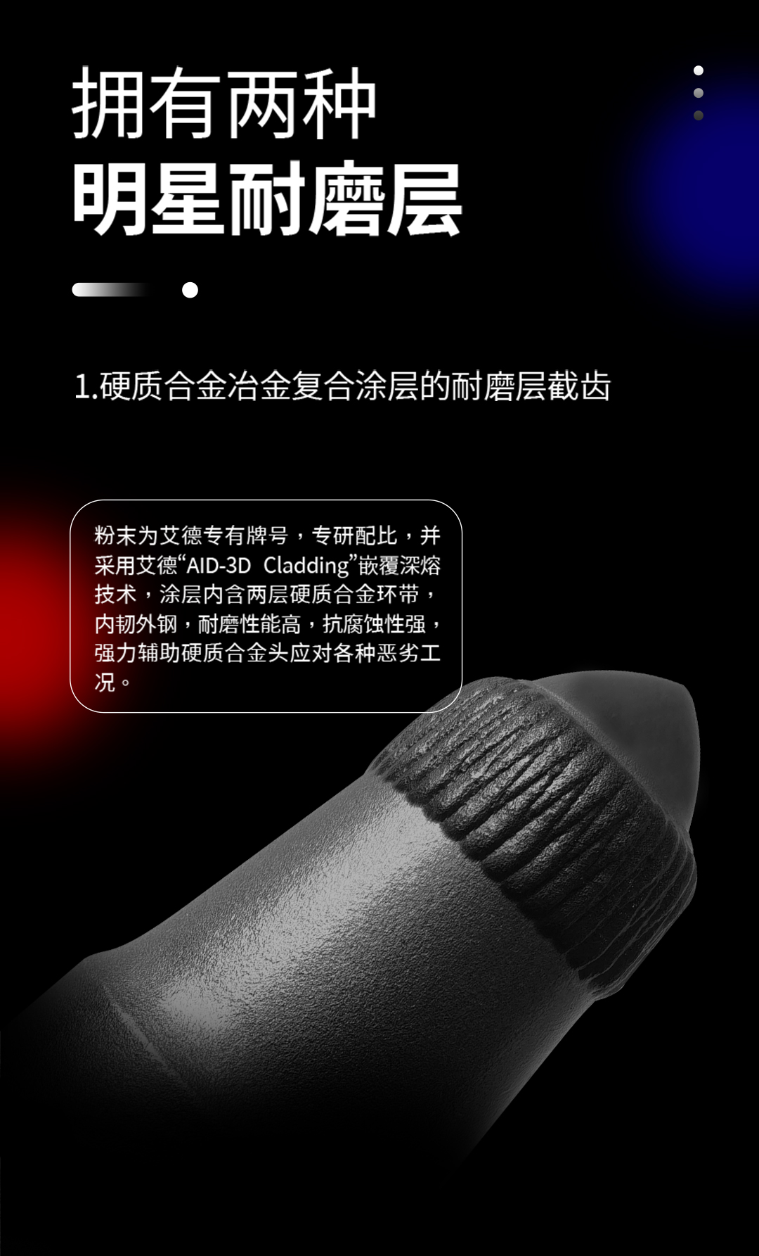 产品材质:钨钴硬质合金(合金头); 碳化钨,硬质合金冶金复合材料(耐磨层); 42Crmo合金钢(齿体)