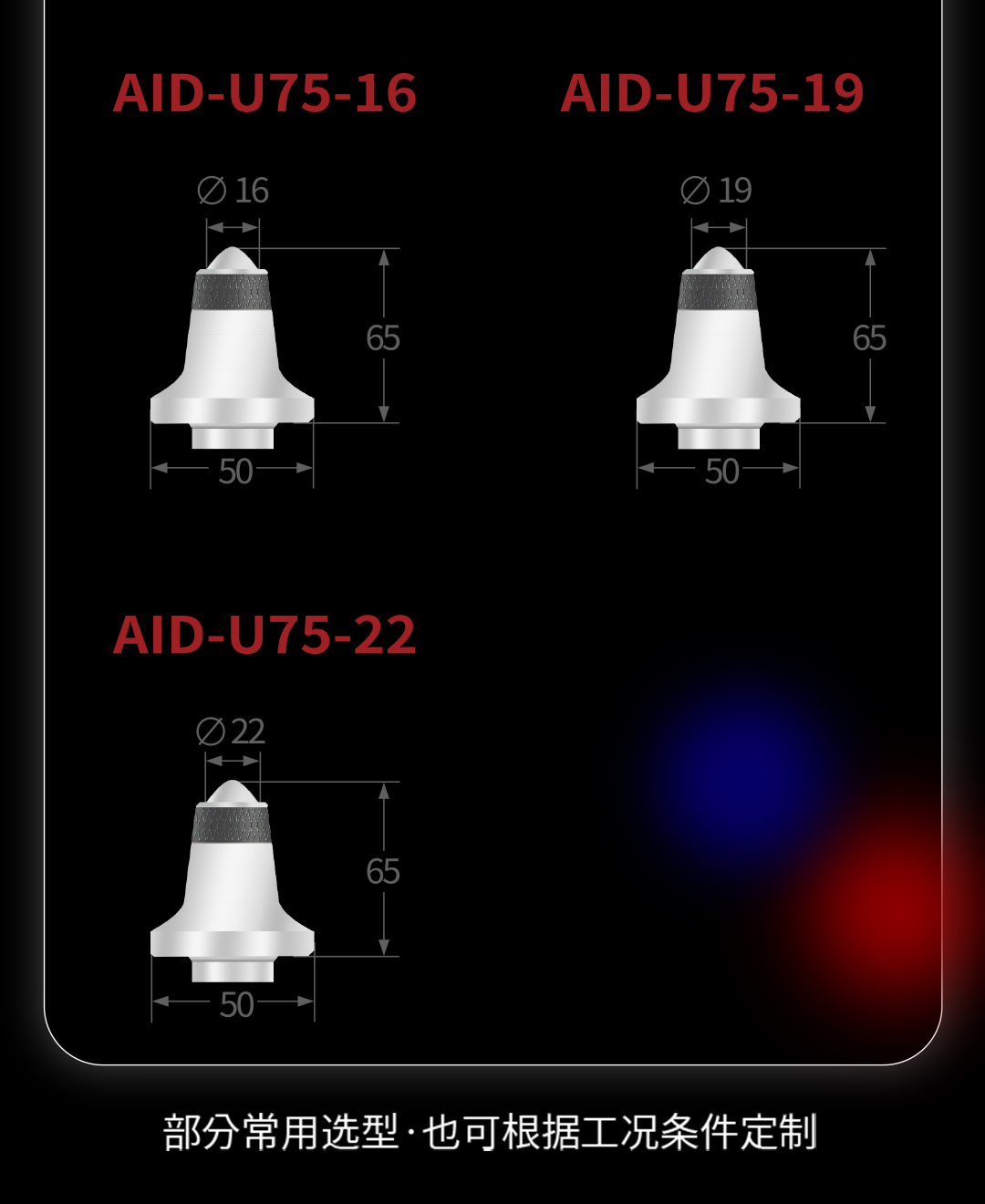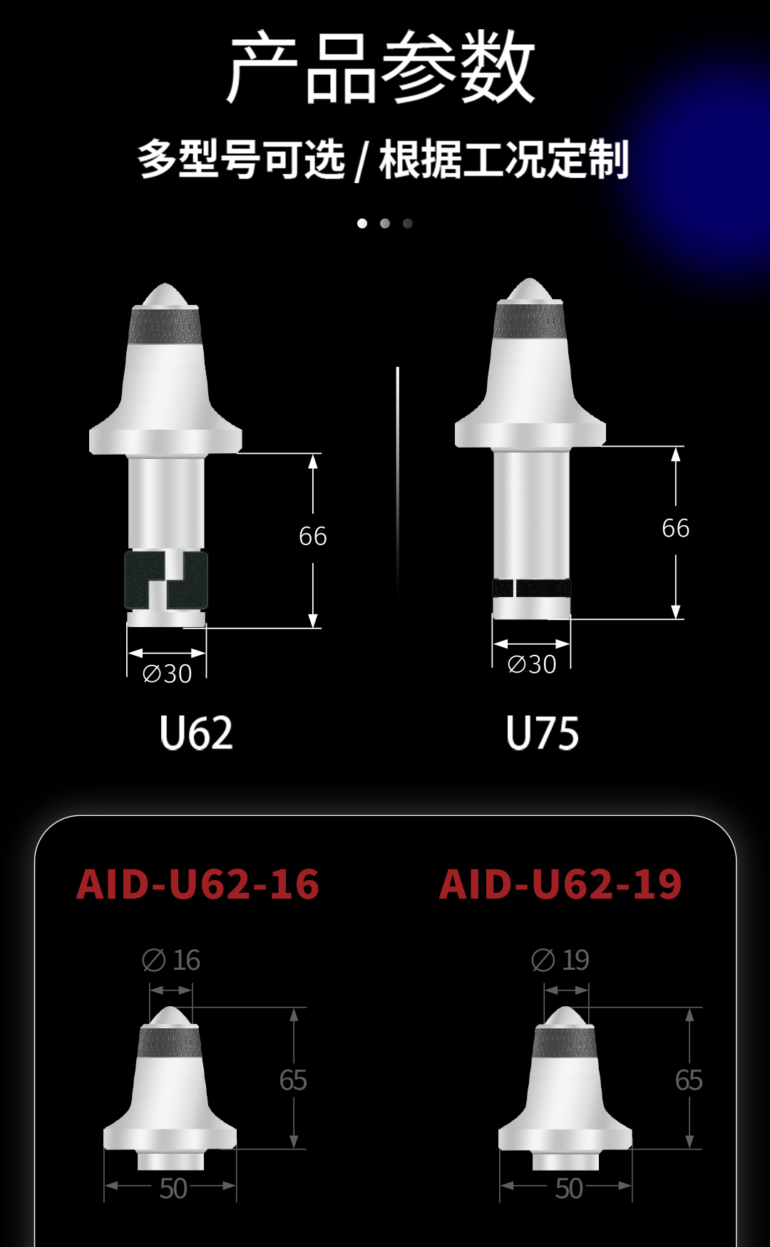 产品特性:艾德U62/U75采煤机截齿适用于中小功率采煤机;高硬度耐磨层保护主合金,提高截齿使用寿命;最新硬质合金,渗透力强、截割效率高; 硬质合金选配范围16mm~25mm。