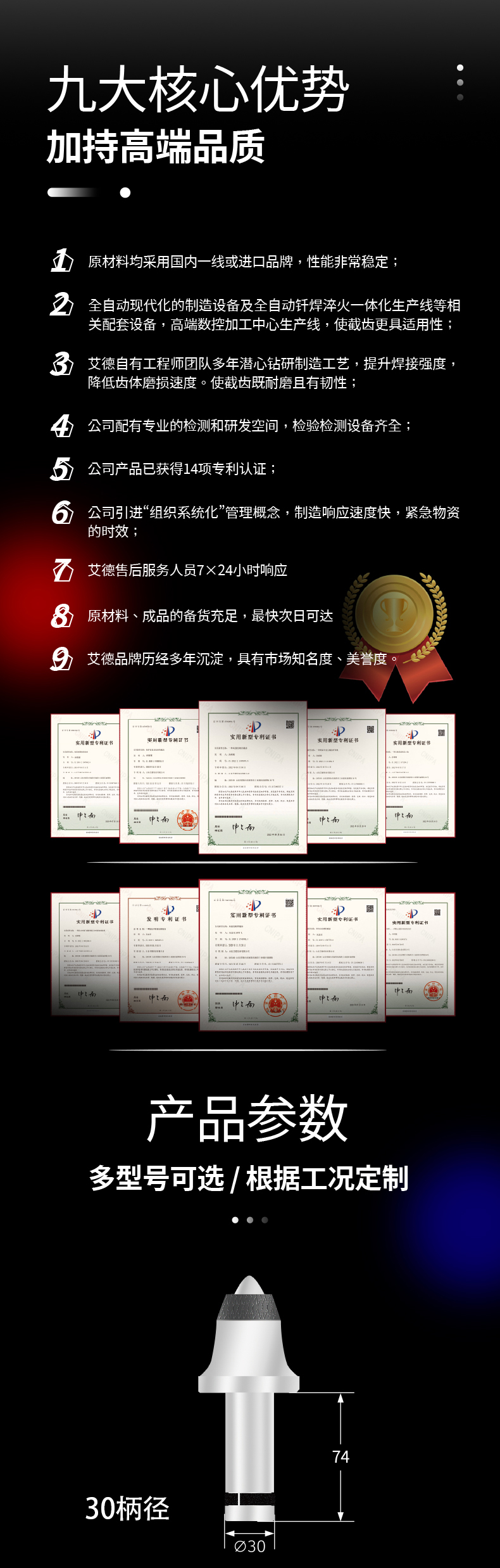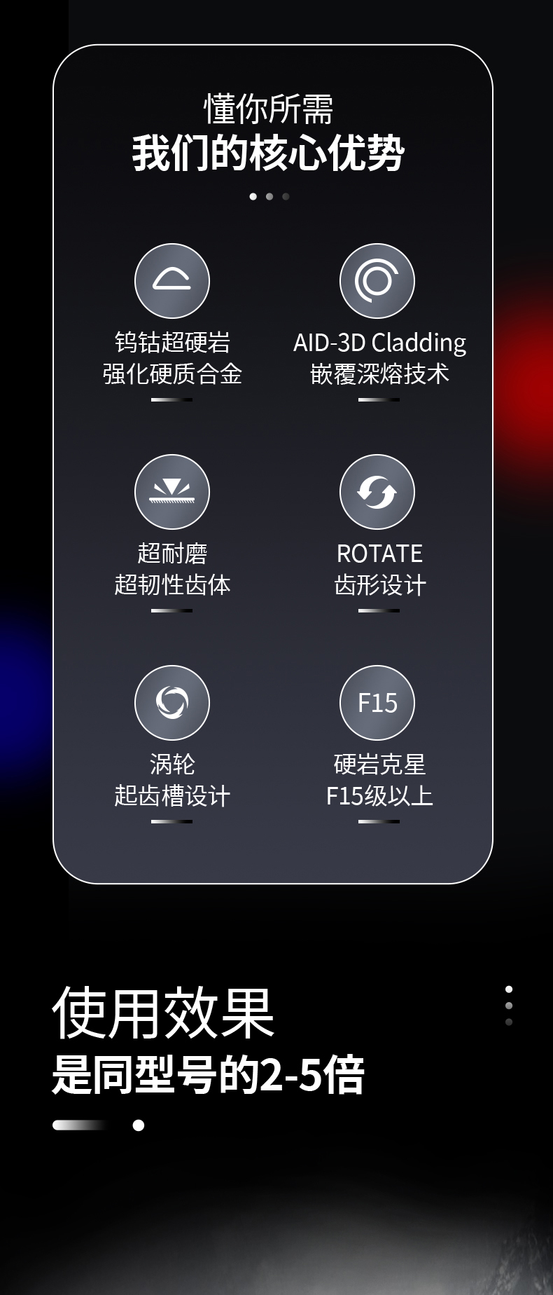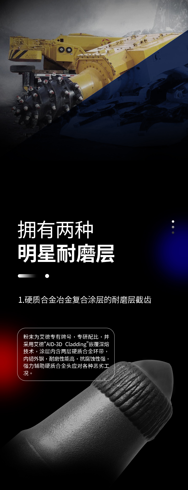 产品材质:钨钴硬质合金(合金头); 碳化钨,硬质合金冶金复合材料(耐磨层); 42Crmo合金钢(齿体)