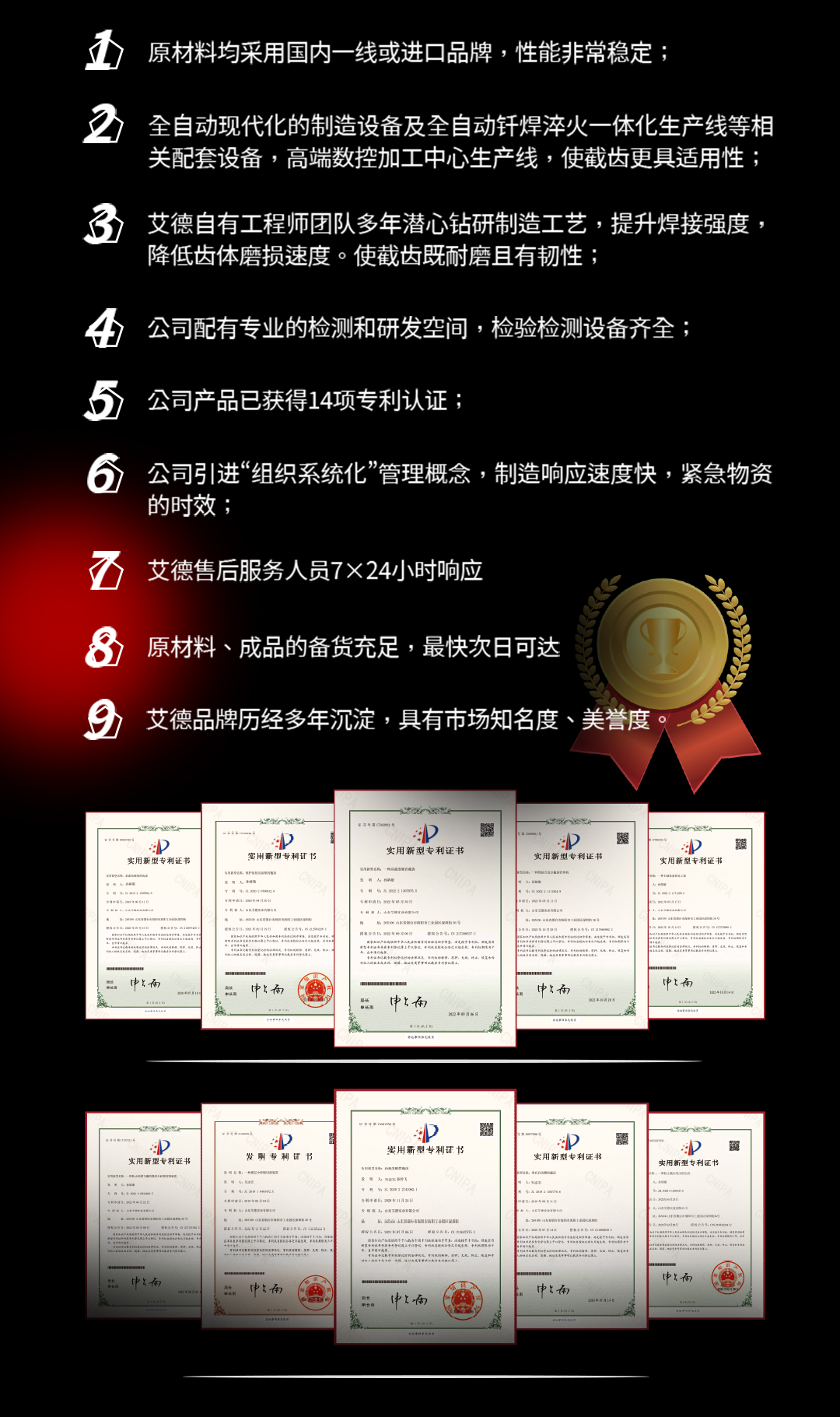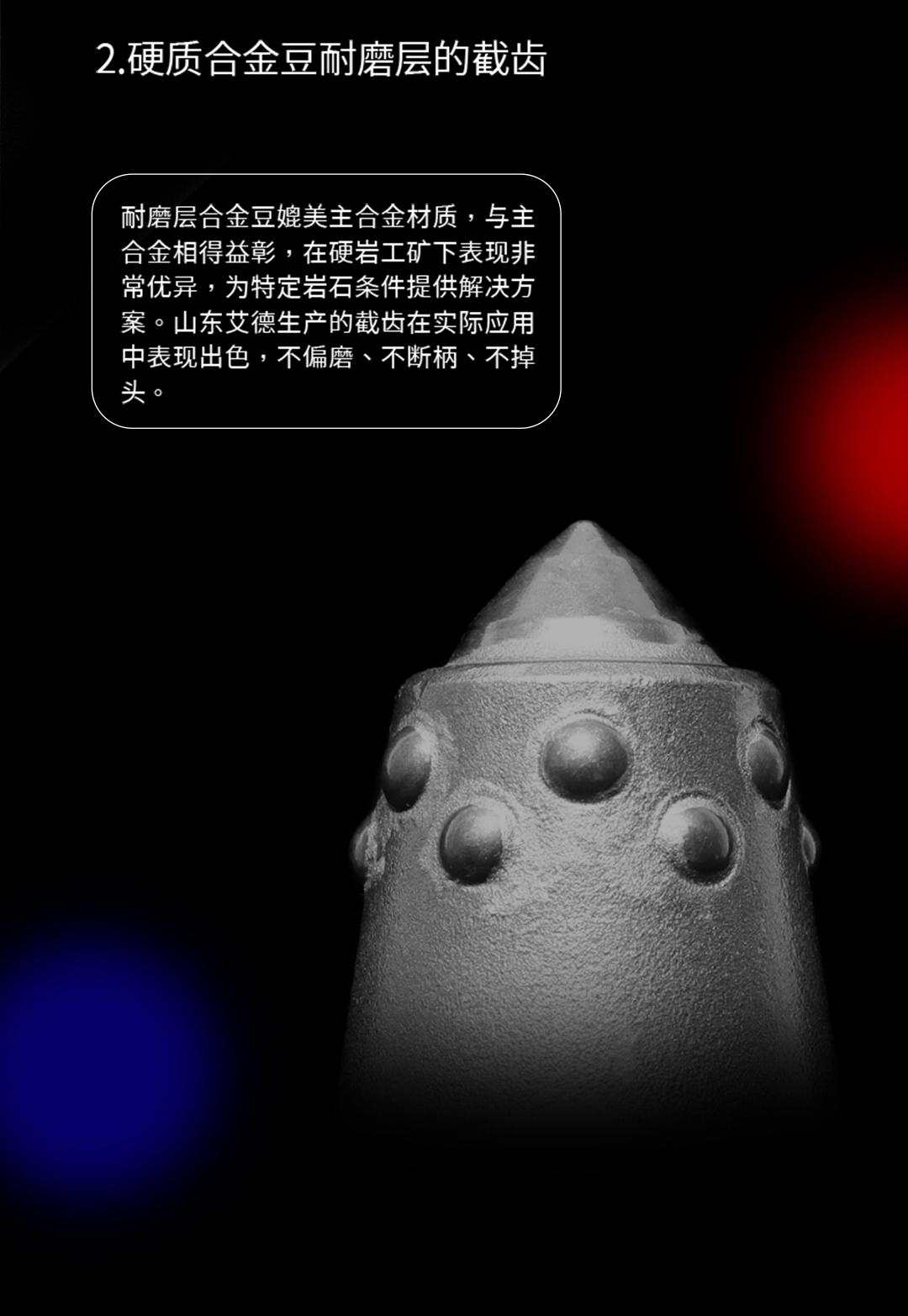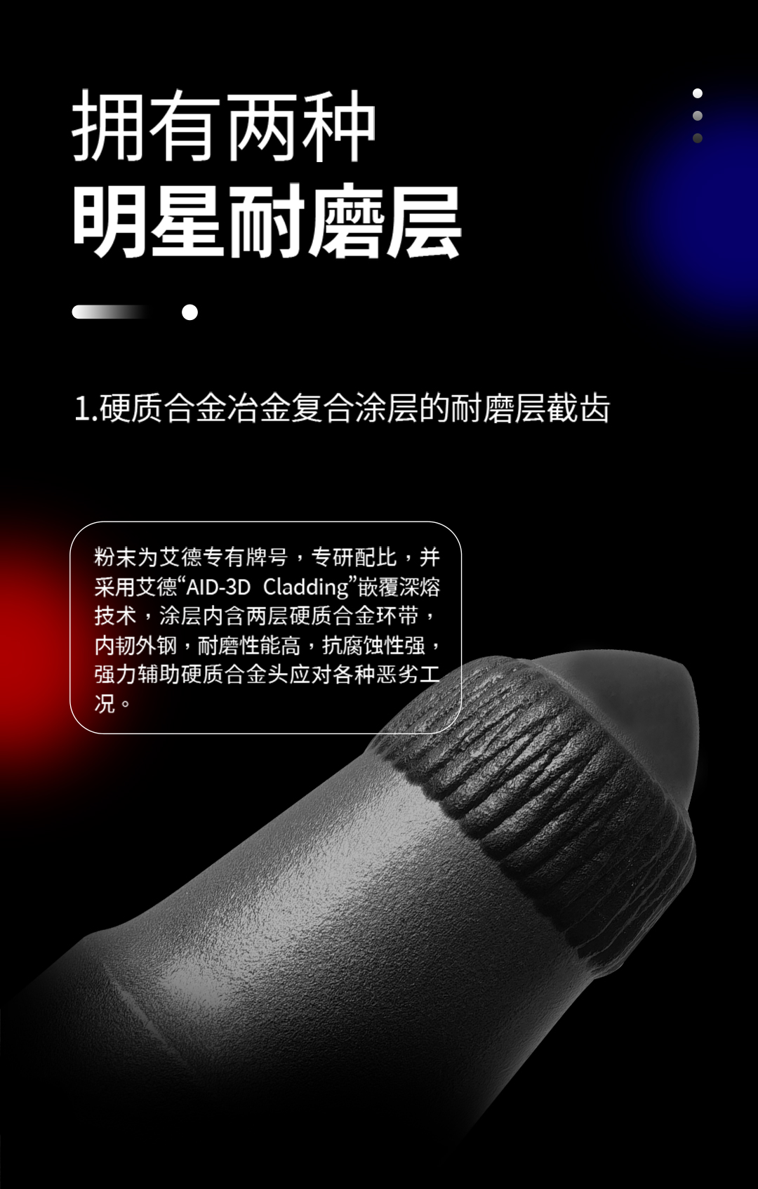 产品材质:钨钴硬质合金(合金头); 碳化钨,硬质合金冶金复合材料(耐磨层); 42Crmo合金钢(齿体)