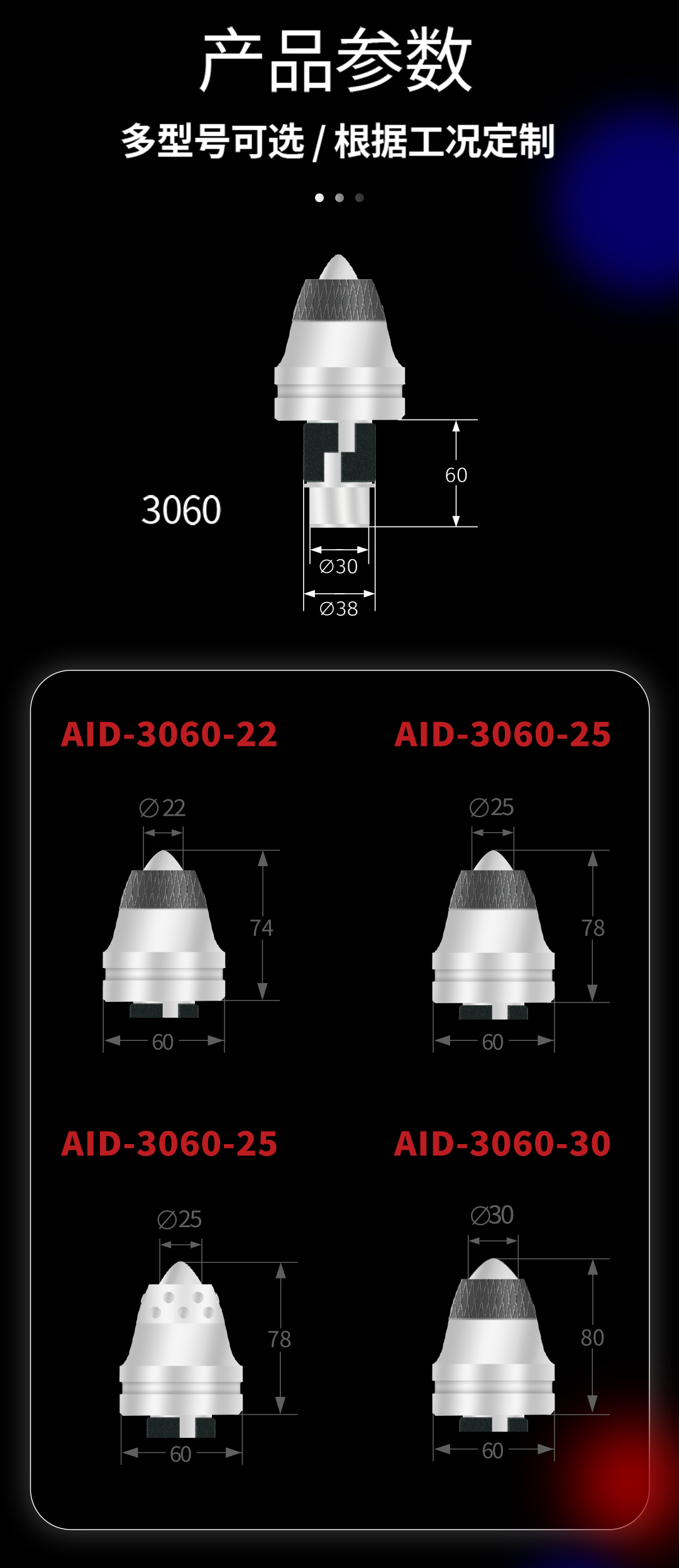 产品特性:艾德3060旋挖机截齿属于硬岩级截齿,适合重型工况;标准主体设计、宽大法兰肩提供最大齿座保护;适用于城市建设等基础施工;抗高温火花、高强耐磨、更换迅速;抗冲击强、渗透性好;硬质合金选配范围19mm~35mm。